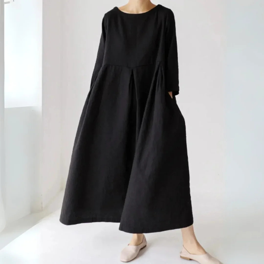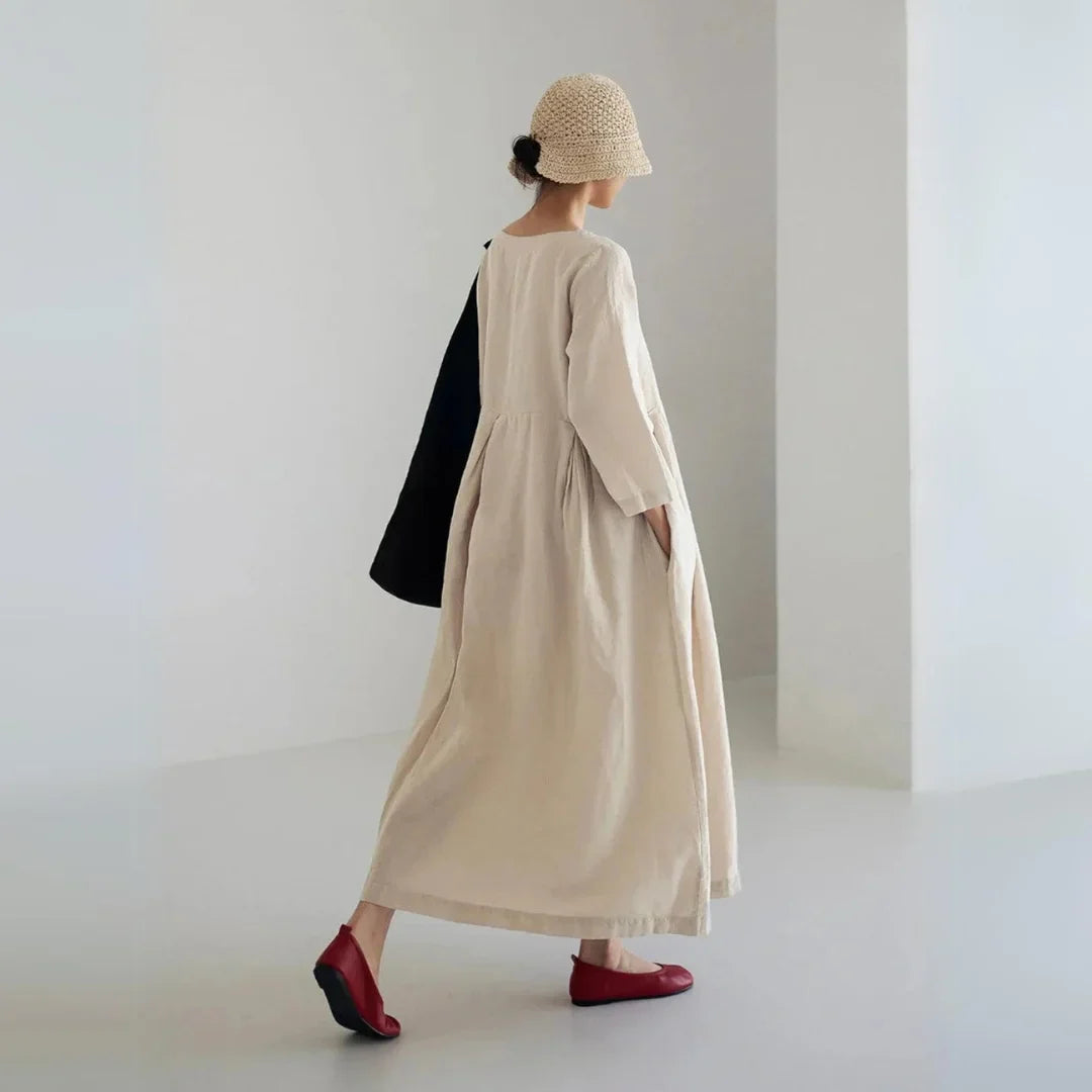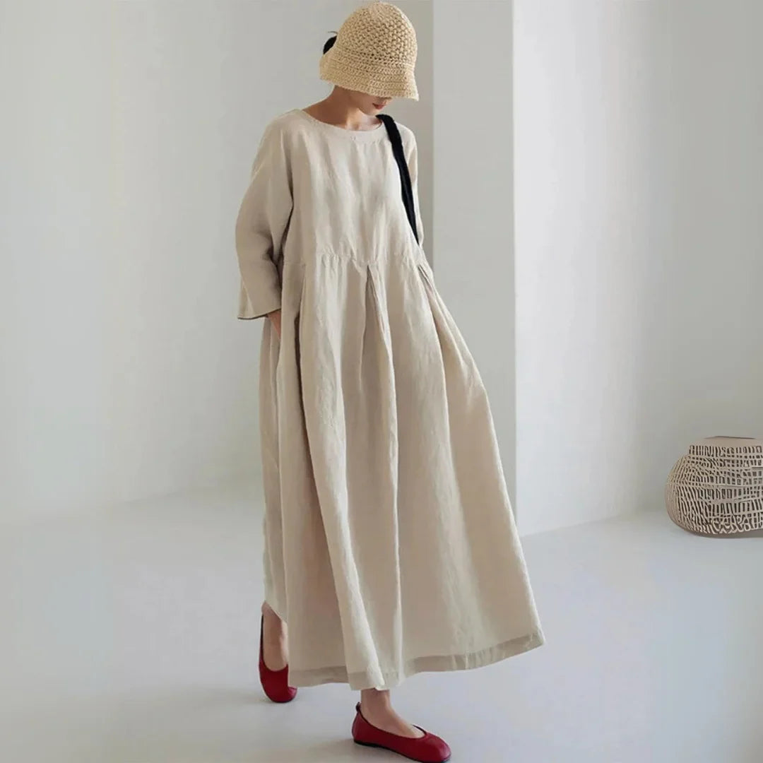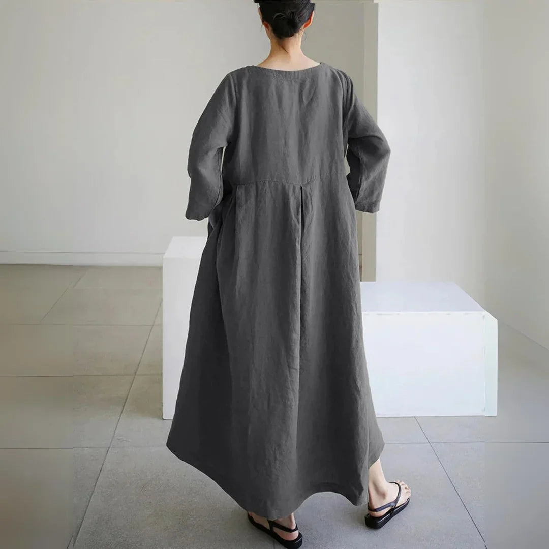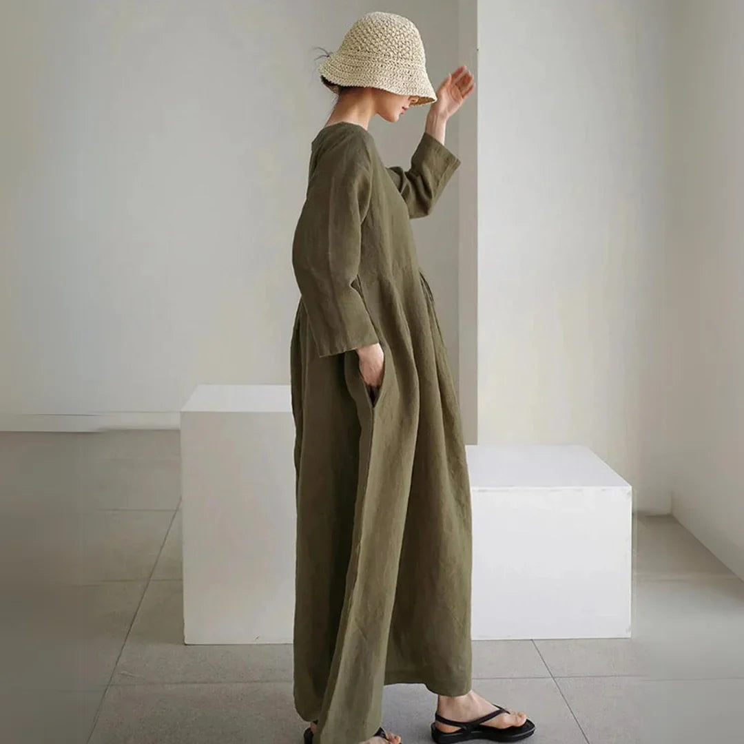 De Flora Losse Linnen Jurk biedt een comfortabele en stijlvolle optie met een mix van 50% katoen en 50% linnen. Met een ronde hals, lange mouwen en een losse pasvorm is deze midi-jurk perfect voor elke casual gelegenheid. De zijzakken voegen een praktisch tintje toe.